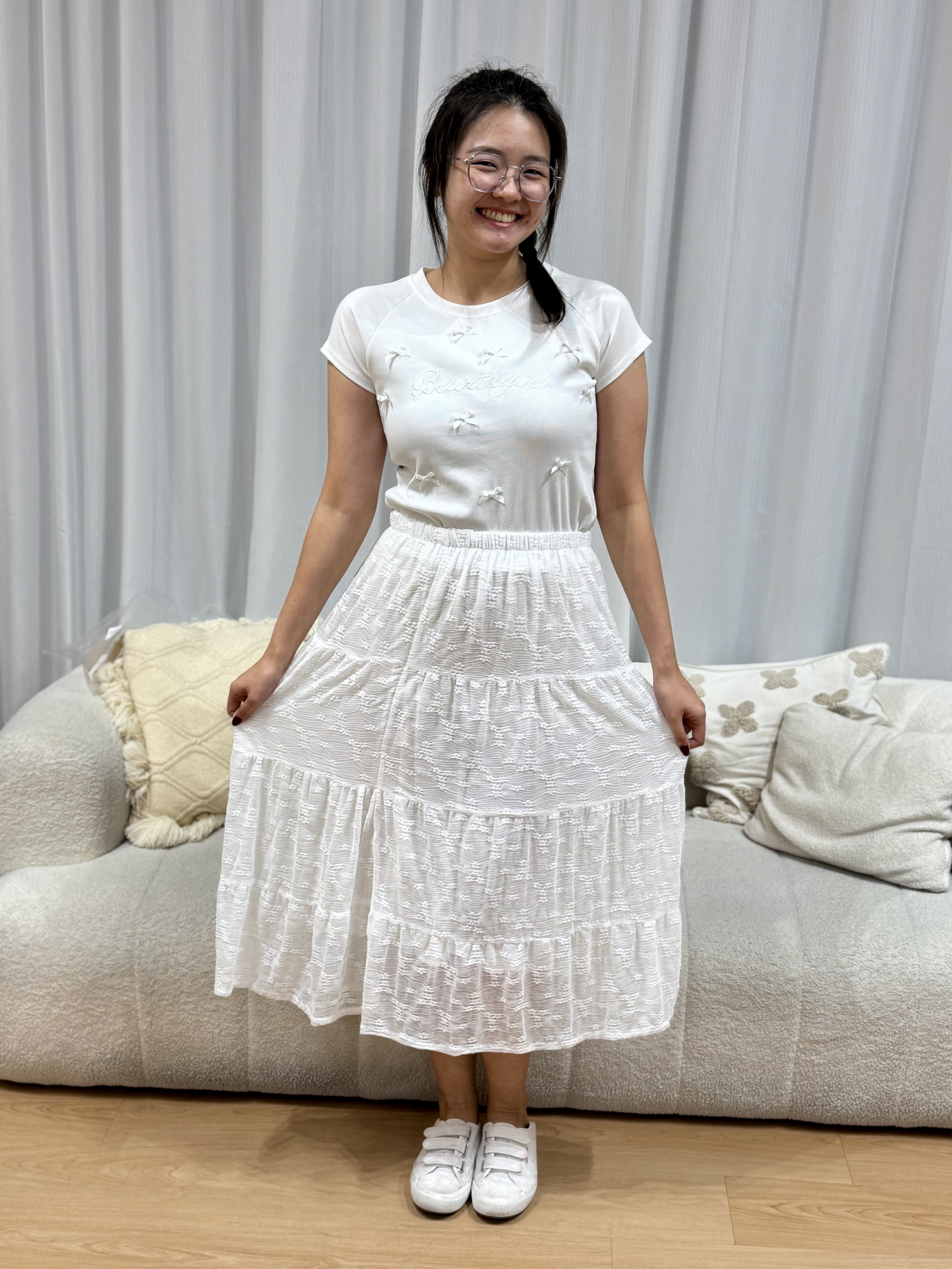 This skirt comes with inner linning make this white skirt non-sheer.